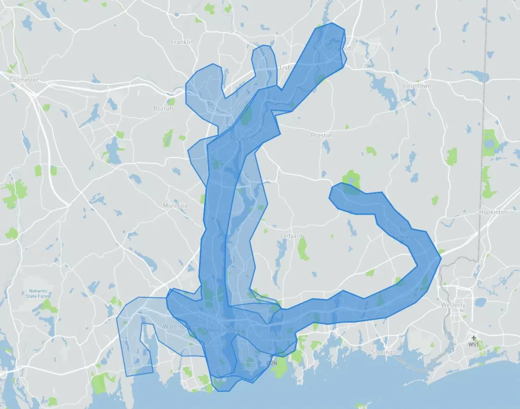 We operate within the ranges shown below, or 3/4th of a mile on either side of the centerline of our fixed-route services.