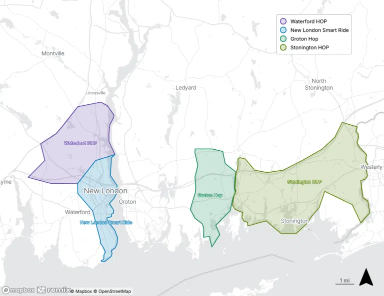 Our micro-transit services currently operate in the defined areas of Waterford, New London, Groton and Stonington shown in the provided image.