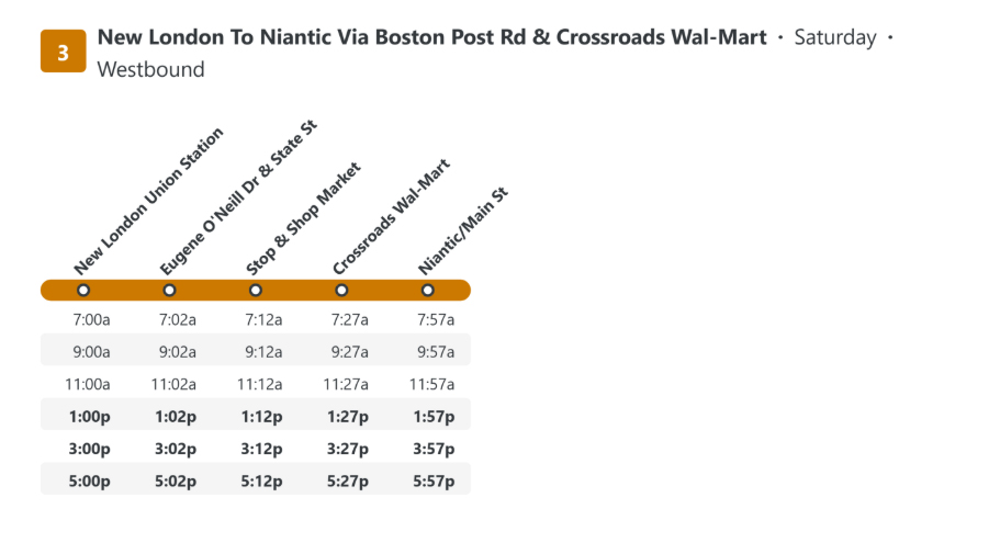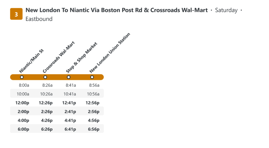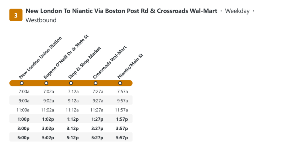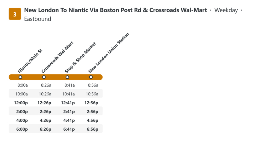La route 3 assure le transport en semaine entre la nouvelle station de London Union, les régions de Groton et de Niantic.