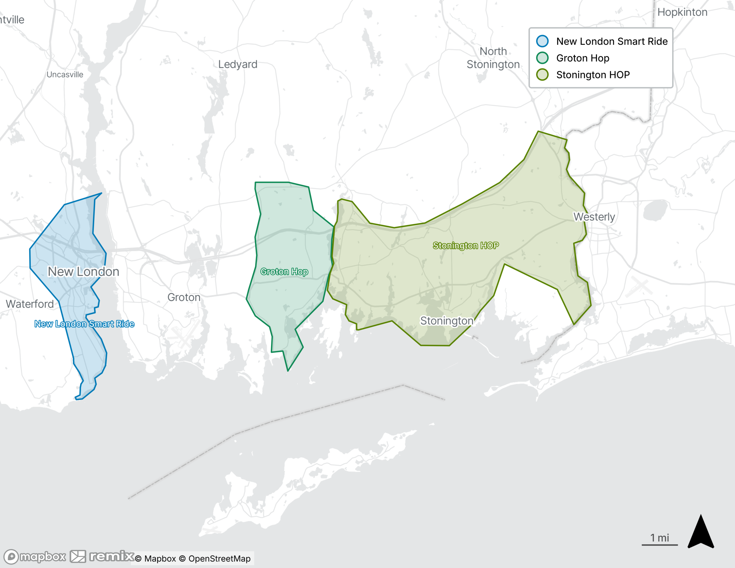 Our micro-transit services currently operate in the defined areas of New London, Groton and Stonington shown in the provided image.