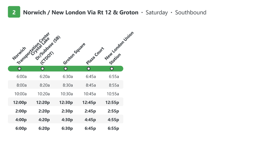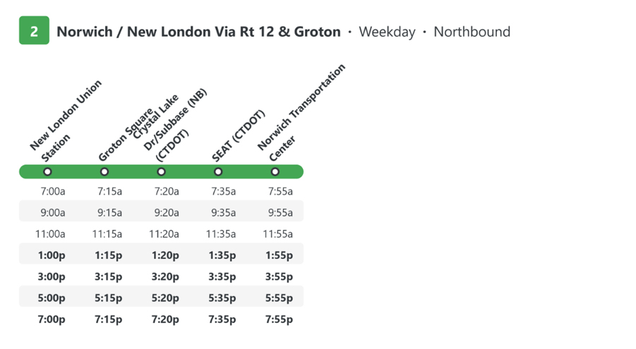 A rota 2 fornece transporte entre o Centro de Transporte de Norwich e a New London Union Station, enquanto pára nos principais pontos ao longo do caminho.